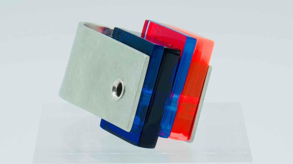 The Dhoek Collection, consisting of earrings and pendants, is inspired by the symbolism of the number 3, reflecting a stage in life of self expression and forward motion. Pieces tend to be constructed using 3 materials, Pewter, acrylic and the rivet component.